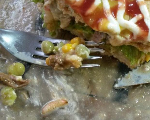 Um recheio a mais, e nojento, surpreendeu o auxiliar administrativo de 26 anos, morador de Porto Alegre, quando ele estava na metade de um Xis Strogonofe, na tarde de 19 de junho. Quando se preparava para mais uma mordida, o auxiliar, que pediu para não ser identificado, viu cair uma larva do meio do lanche.